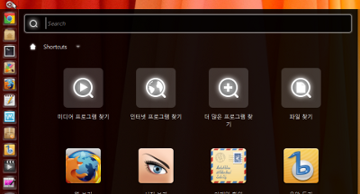하지만 우분투 로고를 클릭하지 않더라도 윈도우키(좌측 - 컨트롤과 알트 사이, 우측은 키보드에 따라 다름)를 통해서 해당 메뉴를 실행시킬 수 있고, 또한 우측 상단에서 프로그램들을 원하는 항목에 맞추어 볼 수가 있어서 크게 불편하지는 않습니다. 또한 검색을 통해서도 쉽게 찾을 수도 있습니다. (윈도우키 누르고 바로 프로그램 이름 입력가능)