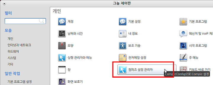 '그놈 제어판'에서 '컴피즈 설정 관리자'에 들어가 줍니다.