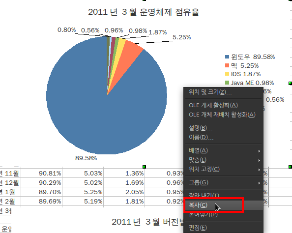 우선 LibreOffice Calc에서 원하는 차트를 선택한 후(초록색 선택창이 나오게), 마우스 우클릭으로 '복사'를 클릭합니다.