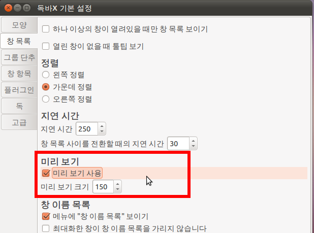 다른 독들에 비해 눈에 띄는 '미리 보기' 기능을 사용하려면 '창 목록 - 미리 보기'에서 '미리 보기 사용'을 클릭합니다.