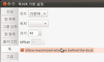 'Allow maximized windows behind the dock'이란 체크박스는 체크시 창을 최대화하면 독 뒤에까지 영역을 차지하고요, 체크해제시 창을 최대화하면 창이 독바를 가리지 않습니다.