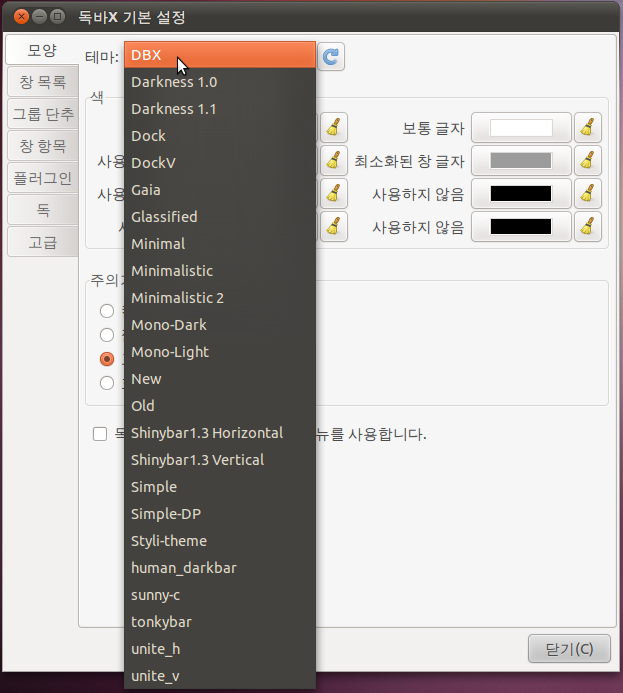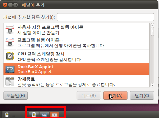 위의 명령어를 입력하고 AWN의 preferences(속성, 환경설정 등)에서 독에 DockBarX를 추가합니다.
