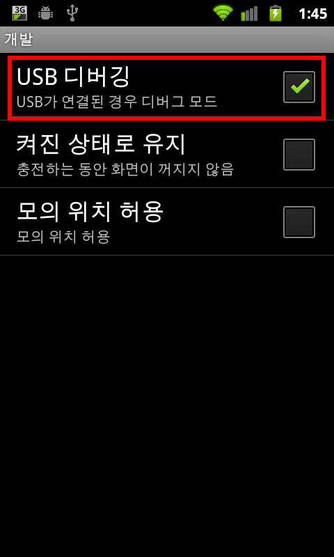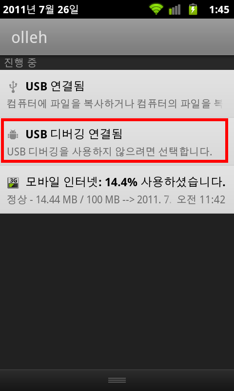 상태를 확인하시면 'USB 디버깅 연결됨'이라고 표시됩니다.