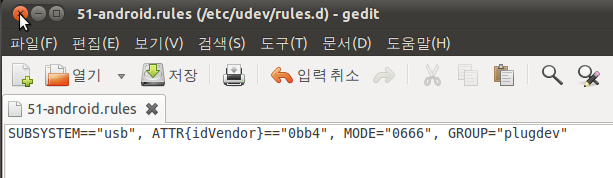 위의 명령어로 '/etc/udev/rules.d/'디렉토리에 '51-android.rules'란 파일이 생성되고 gedit가 실행됩니다.