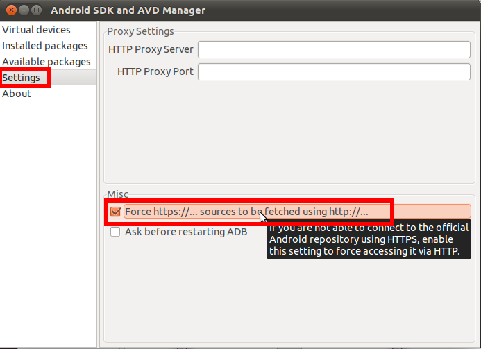 우선 'Settings'에서 'Misc'의 'Force https://...sources to be fetched using http://...'을 체크합니다.