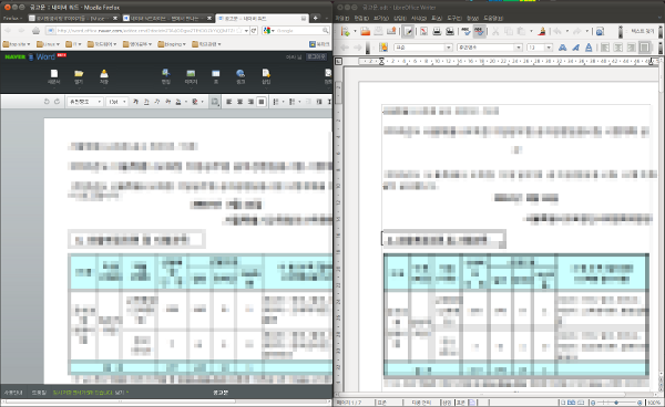 위는 '네이버 워드'와 'LibreOffice(리브러오피스, 리브레오피스) Writer'를 비교해본 모습입니다.