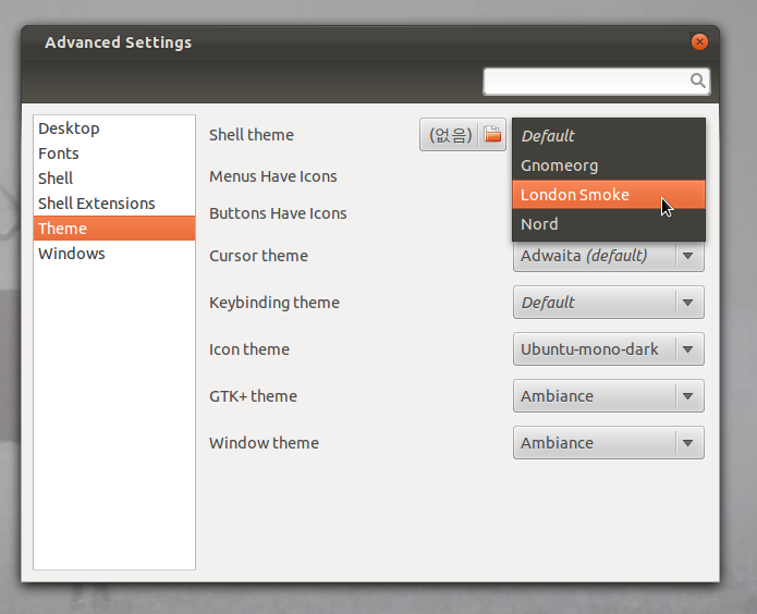 저는 'London Smoke(http://therealpadster.deviantart.com/art/London-Smoke-Gnome-Shell-207708800)' 테마를 다운받아서 설치했습니다.