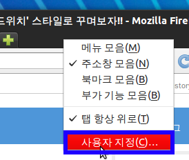 위와 같이 탭 옆부분에 '마우스 우클릭' 후 '사용자 지정'을 클릭하여,