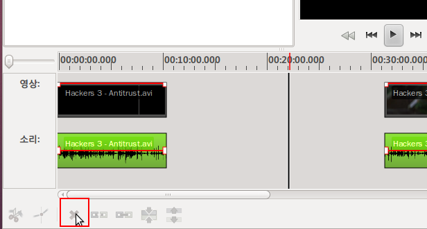 3. 타임라인 밑의 영상이나 소리 부분을 클릭해주고 원하는 지점에서 가위 모양 아이콘을 클릭해줍니다.