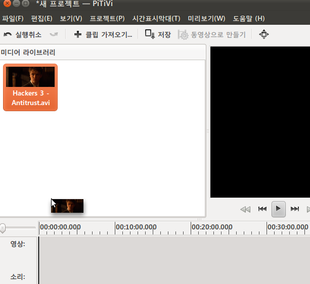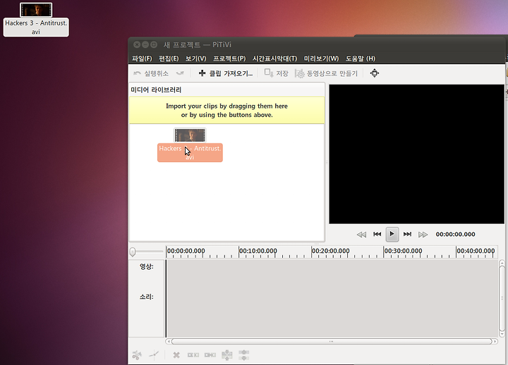 1. Pitivi를 열고 원하는 동영상을 드래그해서 프로그램의 하얀 부분으로 옮깁니다.